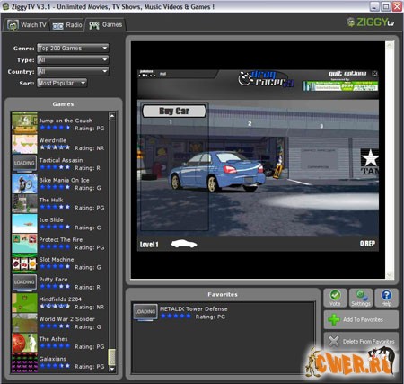 ZiggyTV - программа для просмотра ТВ через интернет. Также можно слушать радио и играть в флэш игры.