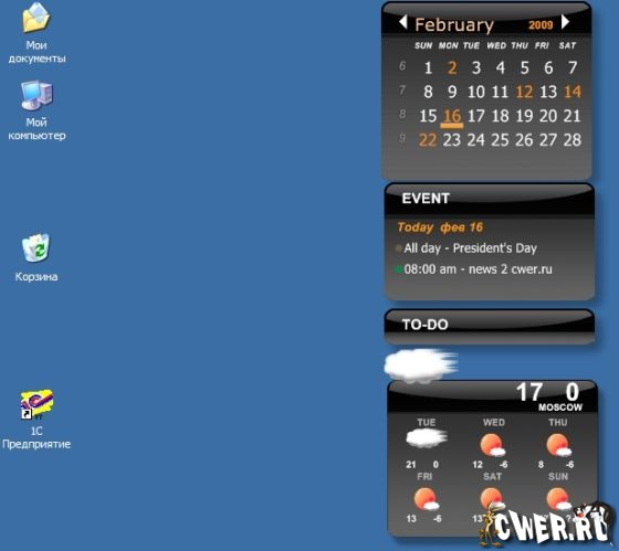 Desktop iCalendar - небольшой календарик, примечательный тем, что может общаться с одноименным сервисом Google. Програмка выполнена в виде виджетов, располагающихся на рабочем столе. Сам календарь может работать как в офлайновом режиме, так и обновляясь с Google Calendar. В настройках нужно указать ваши данные и интервалы обновления. Можно завести несколько календарей, но он будут работать каждый сам по себе, а обновляться будут лишь те, которые присутствуют в аккаунте Google.