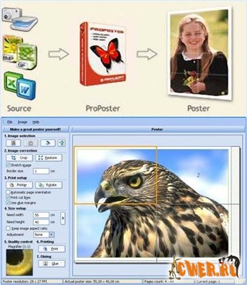 ProPoster программа для создания и печати больших плакатов, знаков, рекламных объявлений без использования специальных плоттеров просто на стандартном принтере. Для создания плаката может быть использован любой рисунок, изображение, документ Microsoft Word, таблица или график Excel. Также возможна печать плаката с цифровой фото камеры или со сканера. Удобный интерфейс и простота использования позволяют за считанные минуты создать высококачественный огромный плакат.