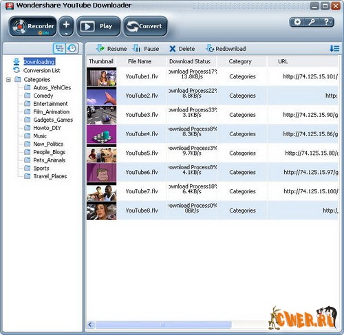 Wondershare YouTube Downloader это программа, которая поможет вам загрузить видео клипы с сайта YouTube а затем сконвертировать их. Программа одновременно загрузит несколько видео файлов а затем сконвертирует их в форматы AVI, MPEG, MP4, WMV, 3GP, H.264/MPEG-4 AVC, MOV, RM, ASF, OGG и др. Wondershare YouTube Downloader может автоматически находить видео файлы YouTube и загружать их на ваш компьютер.