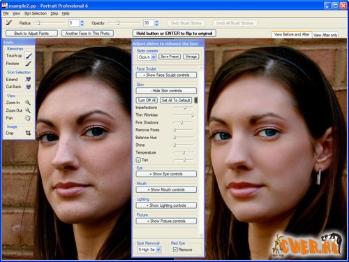 Новое слово в обработке фотопортретов от компании Anthropics, - Portrait Professional Max. В ней реализована уникальная технология, которая, по словам создателей, дает возможность устранять основные недостатки лица на фотографии всего лишь за несколько минут и в полностью автоматическом режиме.
