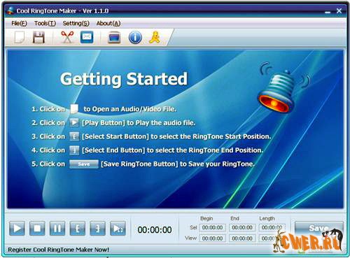Позволит вам сделать ваши собственные рингтоны для сотового телефона. Cool Ringtone Maker поддерживает большинство популярных видео и аудио форматов: MP3, WMA, WAV, AMR, WMV, AVI, MPG, 3GP, MP4, FLAC, OGG, WMV, MOV и т.д., что позволяет делать рингтоны не только с аудио-файлов, но и из видео-файлов.