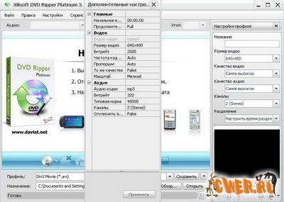 Программа позволяет выбрать язык субтитров, разбить файл на куски указанного размера, задействовать звук Dolby Surround, выбрать битрейт аудио. Кроме этого, программа анализирует тип процессора и в зависимости от этого выбирает наилучшую скорость риппинга. Xilisoft DVD Ripper Platinum полностью задействует возможности последних процессоров и позволяет выполнять пакетное преобразование файлов.