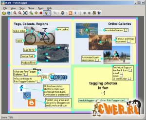 FotoTagger является бесплатной программой для аннотирования изображений в формате JPEG. Вы можете добавлять легко скрываемые комментарии, описывающие отдельные элементы или части изображения, прямо поверх картинки. Каждый комментарий может иметь произвольное местоположение и содержать текст, содержащий имена людей, ссылки на сайты или другие изображения, объяснения, перевод надписей и многое другое.