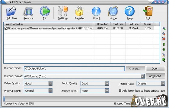 Allok Video Joiner - программа для создания одного большого медиа файла состоящего из AVI, Divx, XviD, MPEG I/II, VOB, DAT, ASF, WMV фрагментов. Позволяет соединять неограниченное количество видео файлов, сортировать последовательность фрагментов, добавлять к уже существующему проекту отрывки, сохранение проекта в AVI, MPEG, WMV, ASF форматах, встроенный проигрыватель поможет осуществить предварительный просмотр выбранного момента или просмотреть часть проекта. Программа проста в обращении, для получения конечного результата необходимо лишь несколько щелчков мышки, высокая скорость соединения без потери качества.