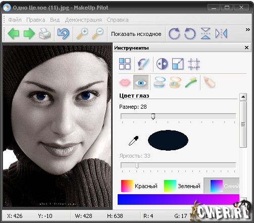 MakeUp Pilot – программы для устранения мелких дефектов на фотографиях. Программа предназначена преимущественно для работы с портретами и дает возможность быстро удалять веснушки, морщинки, дефекты кожи, а также создавать макияж и восстанавливать старые фотографии. Поскольку программа работает как самостоятельное приложение, а не как дополнение в Photoshop, в ней предусмотрены и базовые инструменты для редактирования фотографий: изменение яркости и контрастности, обрезка, поворот, отражение, изменение размера. MakeUp Pilot работает с файлами в форматах .bmp, .tiff, .jpeg и .png. Программа может быть использована как плагин для Adobe Photoshop или другой совместимой программе.