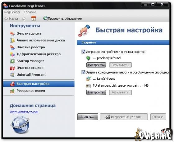 TweakNow RegCleaner помогает очистить реестр от ненужных записей. Все приложения, с которыми вы работаете, при деинсталляции должны убирать все сделанные ими записи в системном реестре. Однако очень многие программы этого не делают. Из-за этого реестр переполняется ненужными записями и разрастается в размерах, что, в свою очередь, приводит к замедлению работы системы. TweakNow RegCleaner быстро сканирует реестр, находит неиспользуемые значения и удаляет их. При этом программа создает файл отката, который поможет восстановить исходные значения в случае, если работа программы вас не устроит.
