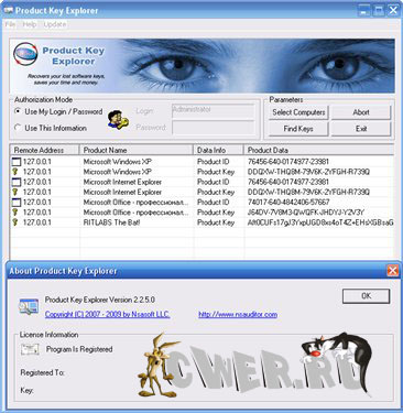 Product Key Explorer - программа позволяет расшифровать, увидеть и сохранить серийные номера продуктов Microsoft, CD-ключи установленных на компьютере программ, и не только их. Неполный список ПО, регистрационные данные которых можно увидеть и сохранить: Microsoft Windows (2000, XP, 2003, Vista), Microsoft Office 2003, Microsoft Office 2007, Microsoft Office XP, Microsoft Visual Studio 2005, Agnitum Outpost Firewall, Macromedia, Ahead Nero, Adobe Photoshop, CyberLink PowerDVD, Borland Delphi, Alcohol 120% и т.д. (поддержка более 500 программ). После запуска программы достаточно будет нажать кнопку поиска ключей и она сама просканирует реестр, и выдаст список программ, установленных на компьютере и регистрационные данные к нем. В программе есть окно для авторизации Администратора, если установлены ограничения на уровне пользователей. Может работать по сети с другими компьютерами и по заданному диапазону IP адресов или по списку IP в текстовом документе.