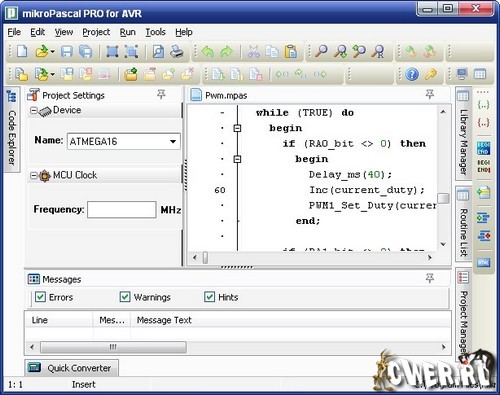 - Использование прилагаемых библиотек MikroPascal существенно повышает скорость разработки. Поддерживаются большинство микроконтроллеров Atmel AVR.