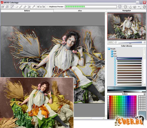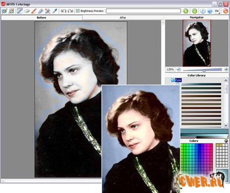 Достаточно несколькими штрихами обозначить объекты для перекрашивания и запустить расчет. Coloriage распознает границы и раскрасит изображение, накладывая цвета с учетом текстур, освещенности и теней. В программу включена богатая Библиотека цветов для выбора тончайших оттенков кожи, волос, листвы, неба и других естественных тонов. Есть возможность сохранять и загружать "штрихи", одним щелчком мыши изменять выбранный цвет.