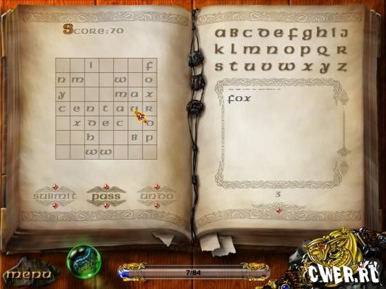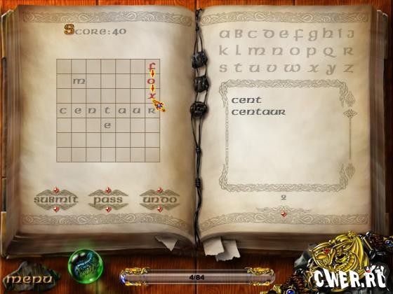 Древние волшебники развлекались, придумывая смешные слова вроде «абракадабра». Игра дает вам шанс показать, на что способны творческие люди – настоящие волшебники! В этой игре ваша задача – собрать максимальное количество слов из минимального числа букв с игровой доски. Не забывайте, кнопка Pass дает вам нужные вам буквы, но ее нельзя использовать, чтобы поставить последнюю букву на доске.