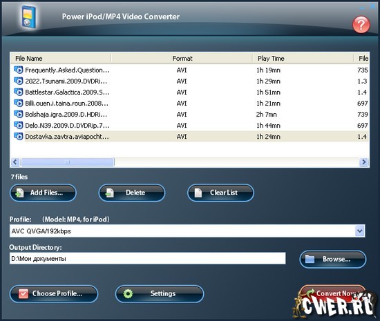 Power iPod/MP4 Video Converter - это отличное приложение для конвертации почти любых видео форматов в видео файлы, созданные для просмотра на iPod. Программа конвертирует разные видео файлы в формат MP4, используя разные кодеки. Поддерживается конвертация файлов AVI, MPEG, DV, WMV, MOV, MP4, RM, RMVB, 3GP, H. 264, VOB и других. Конвертирование файлов происходит с большой скоростью.