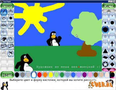 Tux Paint - графический редактор для детей. Программа оснащена прототипами основных "взрослых" инструментов, которые помогут ребенку быстро освоить азы работы с компьютерной графикой.