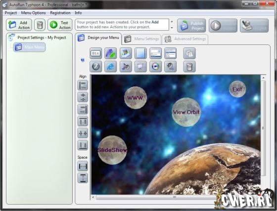 Программа для создания оболочки автозапуска CD/DVD. Сам процесс создания выполнен в виде пошагового мастера, где сборка производится с использованием WYSIWYG - редактора, "Что Вижу То и Получаю", простым перетаскиванием необходимых элементов, по окончании которого у вас будет возможность определить несколько параметров. Из возможностей следует отметить возможность добавления окна запуска (splash screen), которое будет появляться когда диск вставлен в дисковод, кроме того, автозапуск диска можно защитить паролем, выбор программы просмотра для определённого типа файлов и др.