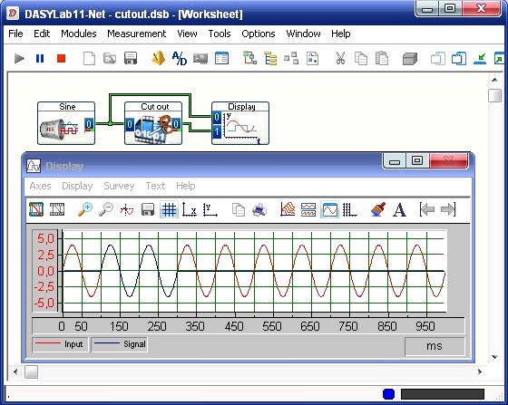 Таким образом возникает возможность распознавания наличия отклонений сигналов времени и частотных характеристик от идеальной кривой. Обнаруженные отклонения индицируются, перерабатываются в сигналы тревоги и оцениваются. Новый диаграммный модуль обеспечивает удобное представление временных и частотных сигналов. До 16 сигналов могут индицироваться по группам и интерактивно обрабатываться и сравниваться. Кроме того в различные модули DASYLab добавлено множество отдельных функций. Теперь инструмент имеет собственный SMTP-Client для передачи Emails в Remote-приложениях, новые навигационные механизмы в Worksheet, упрощенное управление в диалогах. Работу с программным пакетом упрощает развитая система помощи.