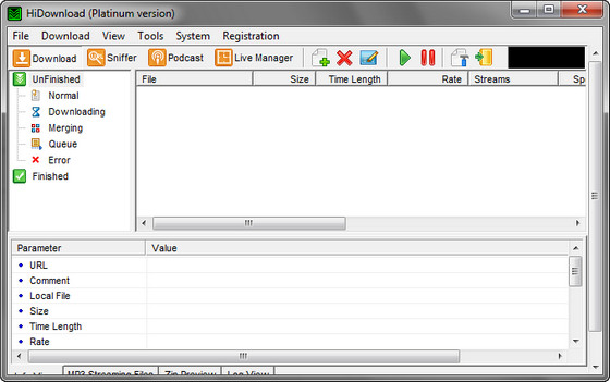 HiDownload - менеджер загрузок. Поддерживает работу по протоколам HTTP, FTP, RTSP (Windows Media), PNM, MMST и MMSU (это значит, что потоковое аудио - RA, RM и Apple Quicktime Streaming - можно "скачать" без проблем). Может работать через прокси, позволяет просматривать архивы и скачивать из них только необходимые файлы, позволяет сохранять Flash, имеется встроенный поиск MP3-файлов. Кстати говоря, есть у этой программы и внутренний поиск.