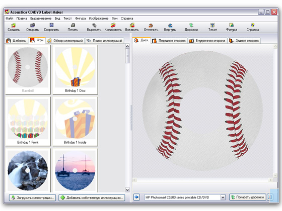 Acoustica CD/DVD Label Maker - одна из самых удачных программ для создания обложек для дисков и рисунков на их поверхности. Эта программа может автоматически помещать на обложку список треков диска, а также использовать для составления такого списка плейлисты программ WinAmp, iTunes, Easy CD Creator и Acoustica MP3 CD Burner. Программа имеет большую библиотеку заготовок для оформления дисков любого содержания – от рождественских песен до дисков с записью видео со свадьбы, дня рождения, летних каникул и т.д. Готовые шаблоны можно редактировать по своему усмотрению, добавляя на них текстовые эффекты. В том числе поддерживается создание надписей по ободку диска. Для неопытных пользователей предусмотрено создание обложек при помощи пошагового мастера.