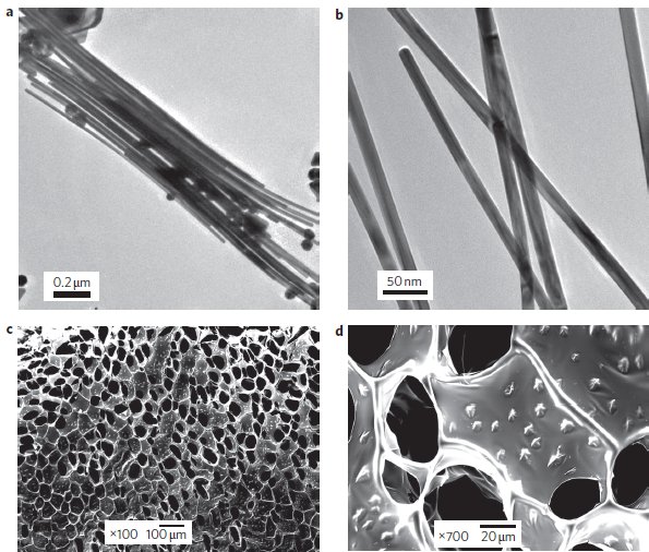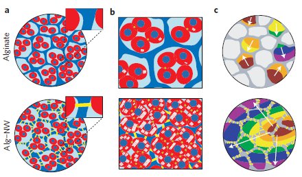 Все дело в том, что пористая структура используемых каркасных материалов препятствует прямому контакту между клетками, затрудняя передачу электрических импульсов. Для обеспечения контакта между разделенными клетками коллектив американских исследователей предложил «навести мосты» золотых (выбранных из-за нетоксичности золота) нанонитей (рис. 1), что отчетливо видно на СЭМ-микрофотографиях (рис. 2). Увеличение проводимости было подтверждено измерением проводимости (для чего пленка композита альгинат-нанонити была нанесено на подложку, покрытую ITO) и импеданса (для чего все та же пленка была зажата между двумя подложками, покрытыми ITO).