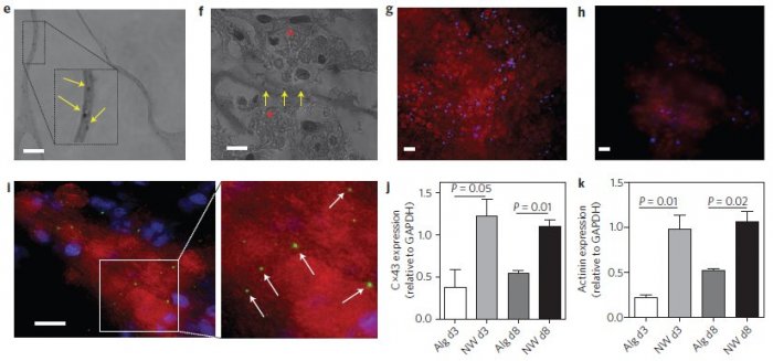Рис. 3. Нанонити в «пустынной» (е) области каркаса и по соседству с клетками (f). Сравните концентрацию тропонина в случае «чистого»(g) альгината и композита (h), а также обратите внимание на распределение коннексина 43 между кардиомиоцитами (i,j). Содержание коннексина 43 (j) и саркомерного актинина (k) для обоих каркасов спустя 3 и 8 дней, полученное с помощью вестерн блоттинга.
