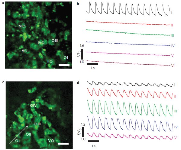 Однако здесь можно задаться уместным вопросом – не будут ли нанесенные нанонити препятствовать росту тканей на альгинатном каркасе? Чтобы развеять все наши сомнения, авторы статьи извлекли клетки кардиомиоцита и фибробласта из левого желудочка падшей смертью храбрых лабораторной крысы и посеяли их на «чистый» альгинат и на композит. Спустя три и восемь дней созревания (первые три в так называемых стационарных условиях без внешнего электрического поля и последние пять с ним) была обнаружена сильная флуоресценция тропонина I (белок, участвующий в связывании ионов кальция и сокращении мышцы) в образце, содержащем композит, но не в чистом альгинате (рис.3).