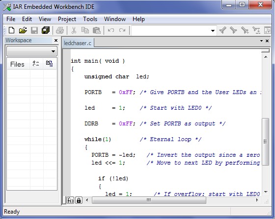 IAR Embedded Workbench for AVR - мощная и эффективная среда разработки программ для микроконтроллеров AVR на языке C, C++ и ассемблер. В состав среды разработки входит компилятор, компоновщик и отладчик. Дополнительные утилиты и хорошая встроенная система помощи дополнительно облегчают написание программ. Она обеспечивает расширенную поддержку устройств AVR и создает очень компактный и эффективный код.