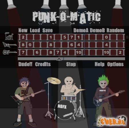 Весёлая флешка! Вы выступаете в роли рок-музыканта, точнее целой рок-группы. В Вашем распоряжении три инструмента: соло-, ритм-гитара и барабанная установка. Путём незамысловатых манипуляций мышью (или клавиатурой), прописываем риффы для каждого инструмента и наслаждаемся своим собственным музыкальным метал-панк-рок шедевром! В игре достаточное количество примеров, поэтому разберётся даже далёкий от музыки человек. Несколько однообразно, но оригинально и весело.