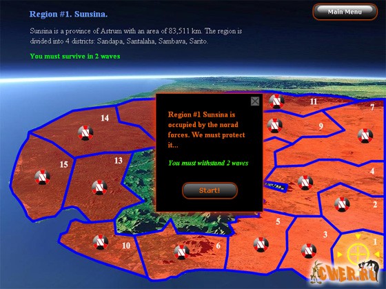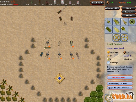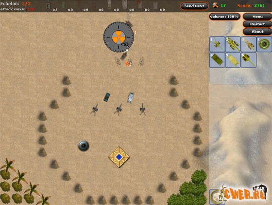 Очередная оборонная флешка. Защищайте Вашу базу от атак военной техники противника. Как обычно, за уничтоженную вражескую технику Вам начисляют денежки! Имеется возможность ремонта и модернизации Ваших юнитов (включая саму базу), причём это применительно как к одной боевой единице, так и ко всем одновременно - просто выделите необходимое количество единиц техники и примените к ним необходимое действие (если хватит денег :-)). Когда враг становится чересчур назойливым, можно (и даже нужно) воспользоваться небольшой ядерной бомбой! Игра имеет два режима - кампания или поединок.