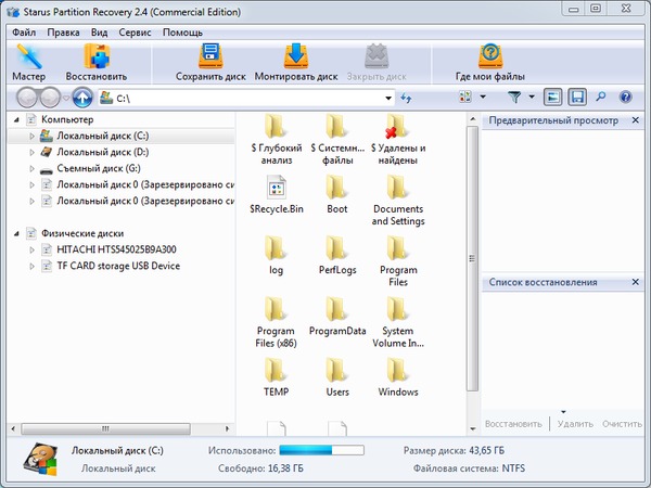 Интерфейс Starus Partition Recovery выглядит и используется так же, как проводник Windows Explorer. Воспользовавшись программой, пользователь увидит знакомые файлы и папки, а так же удаленные данные и логические диски подлежащие восстановлению. Также в полном распоряжении вся возможная информация по файлу и предварительный просмотр в дополнительном окне.