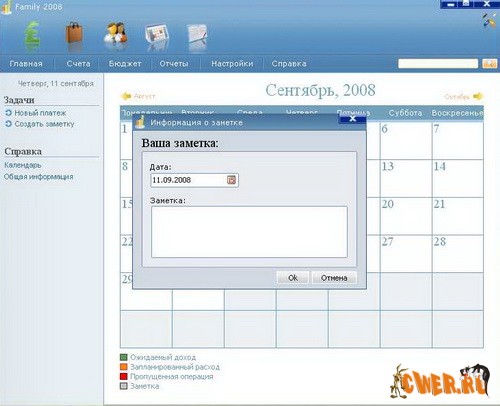 Особенности: Прекрасный внешний вид, Уникальное бюджетирование и контроль, Увлекательные и полезные отчеты, Шоппинг, Удобная контекстная справка. Чувство контроля над своей жизнью, так недостающего сегодня семье, или человеку можно восполнить благодаря программе Family 2008. Власть над деньгами, а не власть денег над нами должна быть в каждой семье, в каждом человеке. Как правильно распоряжаться своими деньгами? Своим временем? Как распорядится вещами в своем доме? Как упорядочить все свои дела и не забывать ни об одном событии, будь то окончание срока гарантии на микроволновую печь, или же собрание родителей в школе своего ребенка? На эти вопросы Вы получите ответ с программой Family 2008!