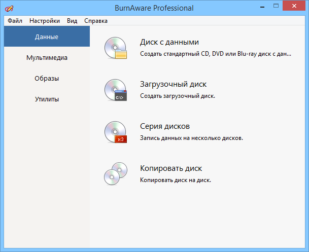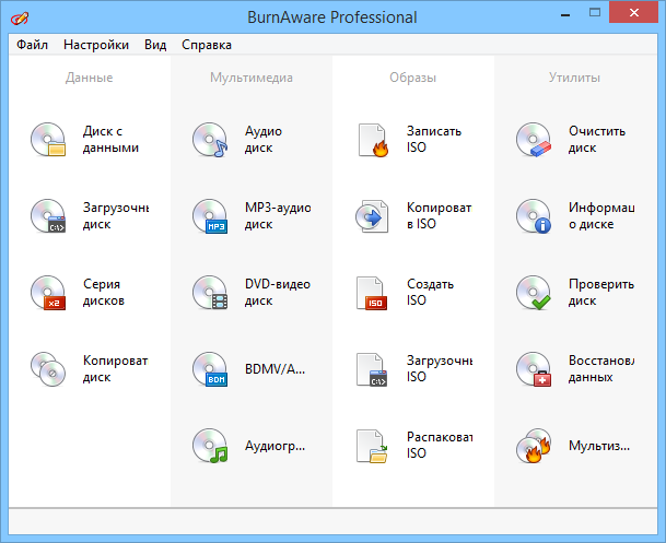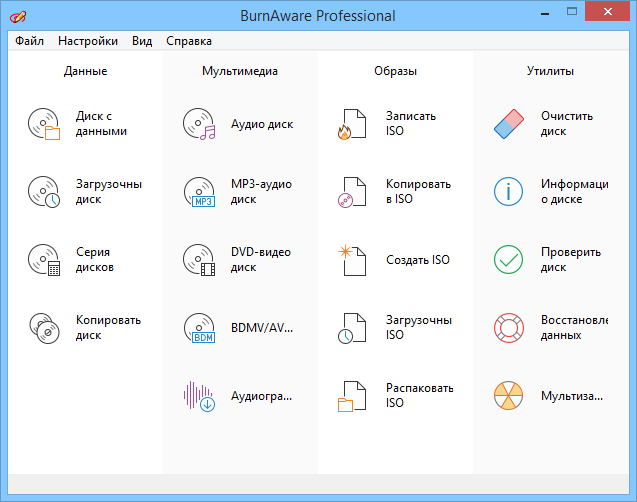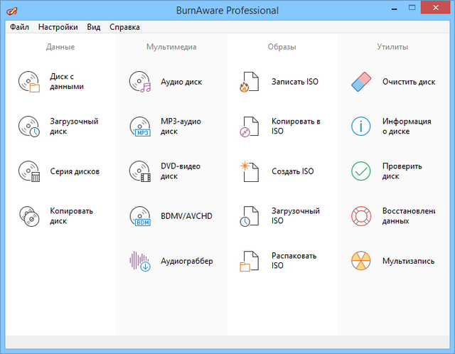 BurnAware Professional - компактная и простая в использовании программа для записи файлов на CD, DVD, Blu-Ray и HD-DVD диски. Поддерживает работу с любыми типами оптических дисков (включая CD-R/RW, DVD-R/RW, DVD+R/RW, BD-R/RE, HD-DVD-R/RW и DVD-RAM) и аппаратными устройствами записи. Есть возможность создания образов, записи мультисессионных дисков, проверки записанного содержимого.