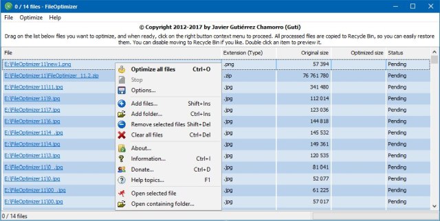 FileOptimizer - приложение для сжатия различных видов файлов без потери их функциональности: изображений, документов, программ, архивов (EXE, DLL, PNG, PDF, JPEG, DOCX, GIF, EPUB, CBZ, CHM, ODT, OBJ, PPTX, WEBP, ZIP, XLSX, SWF, TIF, APPX, APK, APNG, AIR, BMP, PUB, SCR, ICO, MP3, JAR, LIB и многих других). Они займут меньше места на жестком диске, а пользоваться ими сможете как и до сжатия.