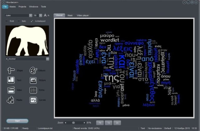 Wordaizer — графический редактор, который позволяет создавать изображения из набора слов. Вы можете сами задать нужные слова, или выбрать текстовый документ и оттуда автоматически будут собраны наиболее часто используемые слова. После этого Вы получите рисунок из слов. Благодаря встроенным фигурам можно выбрать нужную вам или создать свою, а можно просто показать рисунок программе и на его основе будут собраны слова.