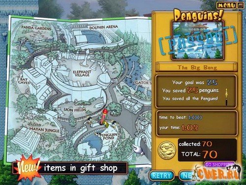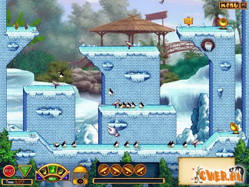 25 пингвинов задумали сбежать из зоопарка и вам, с помощью подручных средств (это батуты, пушки, выстраиваемые лестницы, машины мыльных пузырей, в пузыре пингвины могут летать), необходимо провести их через уровни к свободе.