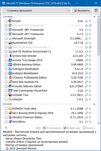 Сборник программ MInstAll для быстрой установки необходимого и часто используемого софта. Представленные программы уже зарегистрированы и не требуют активации. Данная сборка имеет компактный размер, почти все программы устанавливаются в тихом режиме.