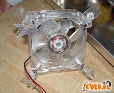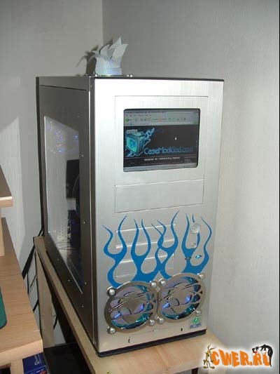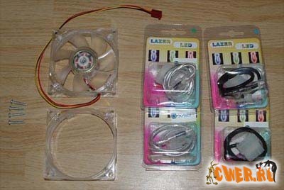 Для моддинга использовались два 80-мм вентилятора Cooler Master и 4 светодиодных пушки: две синих и две зеленых.