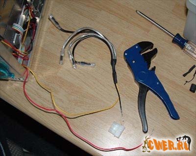 Во избежание появления путаницы в проводах светодиодов отсоединяем Molex-разъемы с концов. Так как все осветительные приборы располагались достаточно близко (в углах нижнего вентилятора), то разумным решением было сделать одну общую оплетку и разъем питания. Сказано – сделано. Тут необходимо помнить, что чаще всего светодиодные приборы, аналогичные используемым, питаются от линии 5 В.