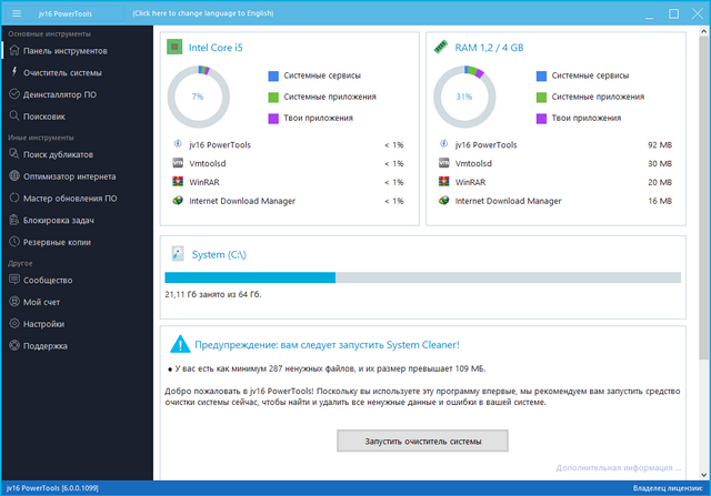 jv16 PowerTools — набор утилит для оптимизации и ускорения работы компьютера, очистки системы. Позволяет управлять файлами, автозагрузкой, реестром и службами Windows, удалять ненужные программы.