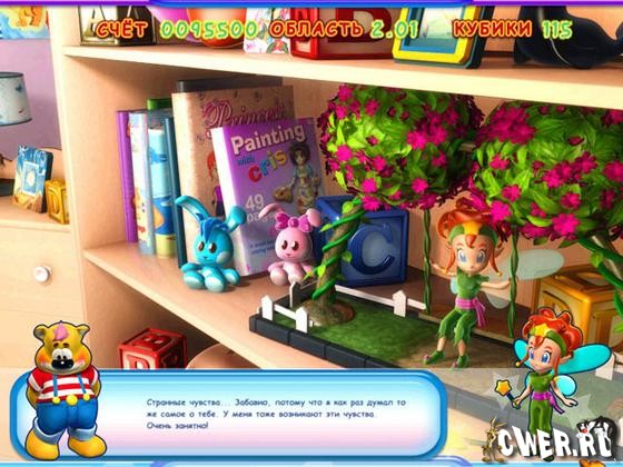Однажды Медвежонок решил сделать генеральную уборку: разложить по местам все свои вещи и собрать разноцветные кубики, разбросанные по всему дому. Решайте интересные задачки, чтобы помочь ему в этом. Навести порядок очень легко: нужно лишь найти на игровом поле группу не менее чем из 2 одинаковых кубиков, а затем щелкнуть по ним мышкой. После каждого удачного хода фишки исчезают, приближая вас к победе. Уровень будет пройден, когда на игровом поле не останется ни одного кубика.