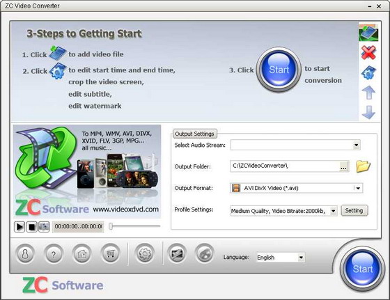 ZC Video Converter — программа, предназначенная для переконвертирования видеофайлов из одного формата в другой. Программа характеризуется высокой скоростью конвертации и огромным количеством поддерживаемых форматов включая AVI, MPEG, MPEG 1, MPEG 2, MPEG 4, VCD, DVD, SVCD, RMVB, RM WMV, MOV, DIVX..... А также поддержка портативных устройств: Ipod, iPhone, мобильного телефона, Microsoft Zune, Apple TV, ITouch, Pocket PC, Sony PSP ECT.