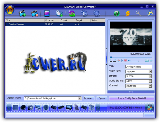Невероятно легкая для использования программа DawnArk video converter позволяет конвертировать все популярные видео форматы: AVI, MPEG, WMV, MP4, H.264/AVC, AVCHD, RM, MOV, XviD, 3GP и др, а также аудио: MP3, WMA, WAV, RA, M4A, AAC, AC3, OGG. Программа также может добавлять водяные знаки в виде текста или изображения.