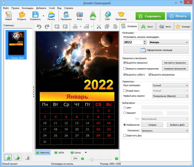 "Дизайн календарей" — очень удобная программа для создания прекрасных календарей с фотографиями на любой год или месяц. Достаточно всего лишь выбрать формат и оформление проекта, добавить фотографии — и получить превосходный календарь. В комплекте присутствует огромный выбор шаблонов высококачественных календарей. Персональный календарь — это не только отличный подарок для друзей и родных, но и прекрасный рекламный продукт для вашего бизнеса.