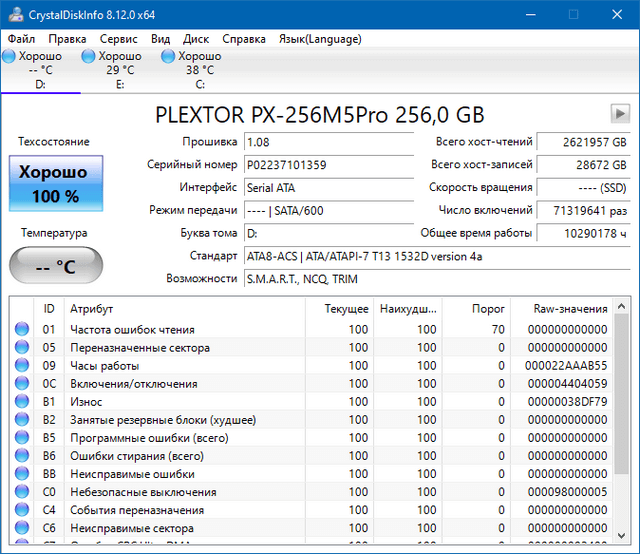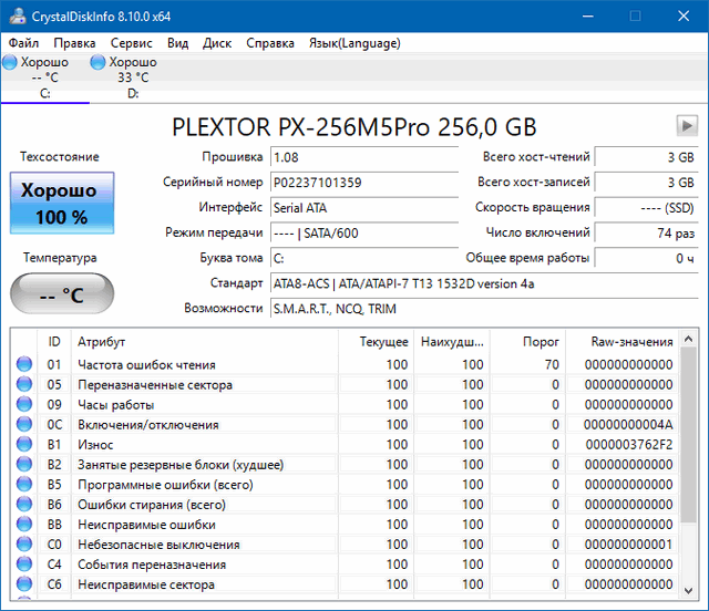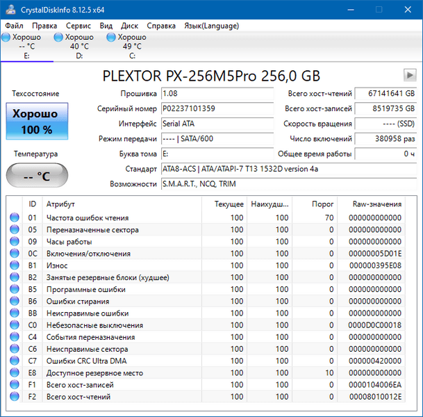 CrystalDiskInfo – следит за «здоровьем» жестких дисков, поддерживающих технологию самодиагностики S.M.A.R.T. Осуществляет мониторинг и дает общую оценку состояния вашего диска. Также выдаёт подробную информацию о жестких дисках, установленных в компьютере (прошивка, серийный номер, стандарт, интерфейс, общее время работы и др.) и выводит параметры атрибутов S.M.A.R.T. (ошибки чтения, производительность, запуски/остановки шпинделя, время поиска дорожки, количество циклов включения-выключения, ошибки секторов и многое другое). Может выводить в трее индикаторы с температурой каждого накопителя, строит график изменения температур. Позволяет управлять настройками производительность/шум.